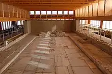 The small size of this type of stibadium is linked to a highly selective banquet, with a few guests allowed to lie next to the owner (dominus), regulated by hierarchical conventions, as in the description by Sidonius Apollinaris (430–481/490).[18] The banquet itself was a show with musicians, actors, mimes, dancers, but also for the self-representation, typical of the late antique aristocratic class, in a space in which everyone, dominus and guests, respected precise social conventions and played a part, replicating the model of the imperial court.[19] The positions of the two quadrangular carpets, with mirrors in giallo antico and pavonazzo framed by serpentine, on the sides of the stibadium underline access to the most important part of the room.