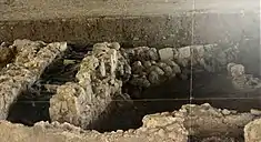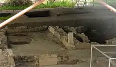 The site has been explored systematically since 1997.[2] The terra sigillata soils were very settled in this region[8] and the excavated area did not permit a rigorous investigation. Artefacts discovered on the site include fragments of Roman mosaics, discovered in 1997 near the Chapel of Santa Catarina; unearthed and examined, the items dated to the 3rd century, suggesting a longer period of settlement.[2][9] It is unclear what purpose the place of its discovery was used; the mosaic was part of the principal pavement of one of the principal halls/rooms in the residential building.[2] More recent campaigns identified peristyles of various levels of destruction, and a triclinium, as well as other unidentified structures.[2] There are various walls of differing heights and orientations, making interpretation difficult.[2]