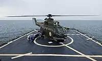 Things changed radically with Romania's accession to the Partnership for Peace and the desire of joining NATO. In this context, the frigate Mărășești (former Muntenia) participated for the first time in a multinational naval exercise led by NATO in the Atlantic Ocean. During the exercise an IAR 316 B helicopter no. 49 and a detachment belonging to 59th Helicopter Group Tuzla, led by the unit's commander, Paul Constantinescu was embarked on the frigate.[1] The lack of proper helicopter-carrying capabilities and especially the lack of ship stabilization equipment, coupled with adverse weather resulted in only two flights over the Mediterranean and one over Atlantic. Even in these conditions, this event remains an important milestone in the reaffirmation of naval aviation in Romania.[1]