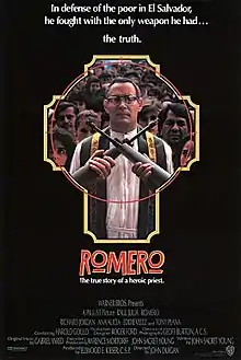 Romero is a 1989 biographical film depicting the story of Salvadoran Archbishop Óscar Romero, who organized peaceful protests against the violent military regime, eventually at the cost of his own life.[3] The film stars Raúl Juliá as Oscar Romero, Richard Jordan as Romero's close friend and fellow martyred priest, Rutilio Grande, as well as actors Ana Alicia and Harold Gould. Although the film depicts true events, there are some fictional characters.[4]
