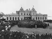 In 1896 the All-Russian Exhibition was held in Nizhny Novgorod. After the exhibition, a branch of the Technical Society was established in the city, which began to address the issue of connecting the city by rail. The company developed a project for the Nizhny Novgorod - Kazan railway. In order not to build a bridge across the Oka, it was decided to run the railroad tracks along the coastal terrace. The location for the station was chosen on the right bank of the Oka, near the pier of the Bashkirov flour mills. Also, the station was located across the Oka opposite the already existing Moskovsky railway station. The construction started in 1900 was completed in 1904. The construction was carried out by the Society of the Moscow-Kazan Railway. The construction was supervised by Grigory Budagov.[1] The view of the railway station was captured by the photographer of the Russian Empire, Maxim Dmitriev.