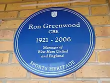 - ↑ "Ron Greenwood blue plaque in London". www.blueplaqueplaces.co.uk. Retrieved 20 February 2018.