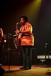 In November 1981 Holloway visited a landmark D.C. club; Blues Alley, where he had been told jazz drummer Norman Connors would be performing. He brought his horn and upon arriving spotted Connors and introduced himself. With an invitation from Connors, he sat in on the next set, getting a good response from the audience. Afterward, Holloway was approached by singer and spoken word artist, Gil Scott-Heron, who complimented him and extended an offer to join his group, the "Amnesia Express".[29] In February 1982 Holloway played his first concert with Scott-Heron at The Bottom Line in New York City with fellow saxophonist and Amnesia Express co-founder Carl Cornwell.[30] The press appreciated his contributions as well, commenting on his performance in several reviews.[31][32] It happened that, early in 1982, Holloway was on board when filmmaker Robert Mugge documented Scott-Heron's concert at the Wax Museum nightclub in Washington, D.C. The film is called Black Wax.[33] Holloway found his playing evolving while in the band, commenting, "I got so many things together on my horn while playing with Gil. It was really a valuable period of self discovery." Holloway was a member of Scott-Heron's group from February 1982 until June 1989.[29]
