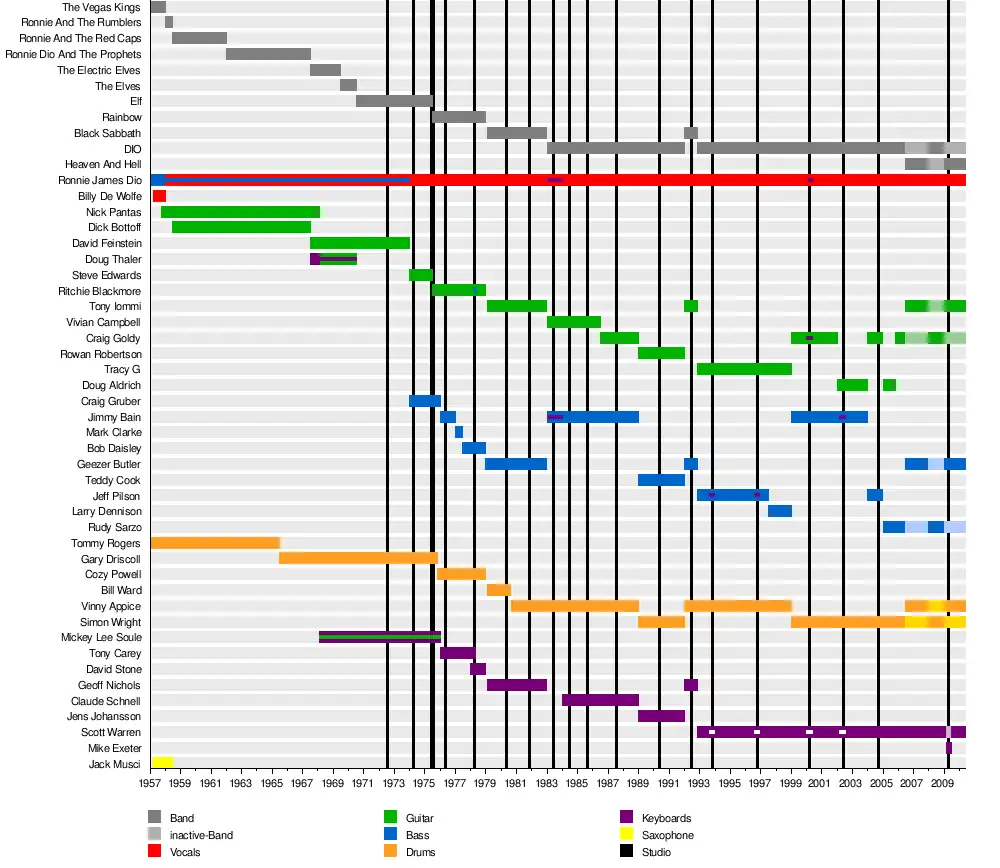 This is a list of Ronnie James Dio releases. Some of his early appearances on 45 rpm singles are collected on several volumes of the LP series The History of Syracuse Music, released in the 1980s. A complete discography with lyrics can be found here.[1]