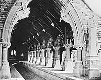 As this location was some distance from the centre of Sydney and from the main-line train station at Haslem's Creek, now Lidcombe station, it was considered necessary to establish a railway station at the centre of the cemetery. This line would run as a spur line from the existing station at Haslem's creek and allow easier movement into and out of the cemetery. The railway line construction began in November 1864 and from 1 January 1865 trains began their run into the cemetery.[5] However, The Sydney Morning Herald advertised the first regular services from 1 April 1867. The times advertised were for services at 8.30am and 4.15pm. Later this was changed to 9.15am and 3pm.[6] It stopped at prearranged stations on the journey from central Sydney in order to pick up mourners and coffins.[5] Some stations, such as Newtown had special platform areas and buildings reserved for mourners and coffins.
