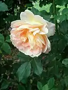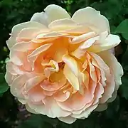 'Lady of Shalott' is a medium, bushy shrub rose, 3 to 4 ft (0.91–1.22 m) in height, with a 2 to 3 ft (0.61–0.91 m) spread.[1] It has a strong, fruity, clove fragrance. The flowers are medium-sized, 3 inches (76 mm), and very full (40+ petals). Orange-red buds open to apricot-orange globular-shaped flowers with salmon hues and a golden-yellow reverse. Flowers are carried in small clusters. Flower colour is apricot-orange with salmon hues and a golden reverse. The rose blooms in flushes throughout the season. Blooms tend to ball up in rainy weather. Leaves start out as a red-bronze colour and matures to a semi-glossy, and dark green.[2]
