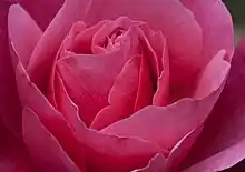 The cultivar grows shoots up to 120 centimetres (47 in) high with medium-sized very double flowers that are pink to pink red and have a very strong fragrance.[5] The rose flowers repeatedly beginning in May or June.[3] The rose grows one to four flowers per stem that are 9 to 10 centimetres (3.5 to 3.9 in) in diameter.[1] The bloom has been described as pink, dark pink, or fuchsia-colored in the style of old roses or resembling a peony.[2][4] The petals are firm, which allows the flower to stay in shape in rain, the inner petals are sometimes whirled or quartered, and petals often have a thin light border and are sometimes crenated.[2] The shrub is very thorny, branches only below flowers, and has large green to dark green foliage.[1][5] Its habit is upright and bushy.[6]