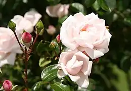 Rosa 'New Dawn' is a light pink modern climbing rose cultivar, discovered by Somerset Rose Nursery in New Jersey in 1930. The cultivar is a sport (genetic mutation) of Rosa 'Dr. W. Van Fleet'. 'New Dawn' was the first plant to be patented.[1] It was patented by H.F. Bosenberg in 1931.[2] 'New Dawn' was voted the most popular rose in the world at the 11th World Convention of Rose Societies in 1997.[3] It is also recognized worldwide as one of the best of the repeating climbing roses.[4] 'New Dawn' is an Earth-Kind rose.[5]