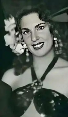 She was discovered in Cuba by the Spanish filmmaker Juan Orol, and made her debut in Mexican cinema in Orol's film A Woman from the East in 1946. She quickly achieved great popularity in the Mexico thanks to her talent, demeanor, and unconventional stature (being very tall for an actresses of the time). For several years, she was part of the film crew of Juan Orol in his best gangster films.[1] Among these are the classic Gangsters Versus Cowboys (1948), considered one of the best Mexican films and considered a cult film in several film clubs around the world. Additionally, Rosa Carmina was one of the principal stars of the Rumberas film of the Golden Age of Mexican cinema in the 1940s and 1950s. Among her principal Rumberas films are Tania, the Beautiful Wild Girl (1947), Wild Love (1949), In the Flesh (1951), Voyager (1952) and Sandra, the Woman of Fire (1954), among others. In her versatile career, Rosa Carmina has worked in various film genres, as well as theater and television. In the 1980s and 1990s she appeared in some Mexican telenovelas. Thanks to her film collaboration with Orol, she was known as The Queen of the Gangsters of Mexican cinema.[2] She is also known under the name Her Majesty The Rumba.[3]