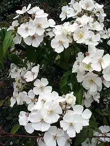 Rosa henryi is a rose species native to China. It is commonly known as Henry's rose.[1] The species is a climbing shrub, 3–8 m, with long repent branches. Prickles are absent or scattered, curved. Leaves are glabrous or sparsely glandular-pubescent with commonly 5 leaflets. The flowers appear in mid to late summer, 5–15 in an umbel-like corymb, each flower 3–4 cm in diameter, white, and fragrant. The hips are brownish red.[2]