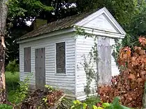 The smokehouse, constructed around 1850, is built of hewn logs and is accessed by a board and batten door with iron hinges. The double-cantilever barn, built late-19th century, is a double-pen barn retaining much of its original cantilevered form, although a tractor shed was later added to the barn. The hay barn, located across the street from the main house lot, is a rack-sided barn with a gambrel roof, built in the 1920s. Except for the smokehouse, all the outbuildings are frame structures.[3]
