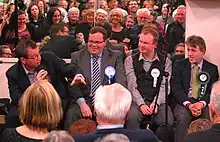 An election declaration for the UK 2019 general election, with four candidates wearing rosettes. Left to right: Conservative, Labour, Brexit, Liberal Democrat