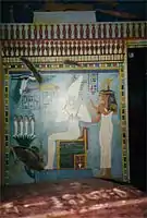 The Rosicrucian Egyptian Museum contains a composite replica of an ancient Egyptian rock-cut tomb, based on photos and sketches taken by Rosicrucian expeditions to tombs at Beni Hasan, in order to give the guests the experience of being in such an excavation. Below are photographs of the interior of the replica tomb, largely containing scenes from the Book of the Dead. The dark interior of the tomb replica is evident.