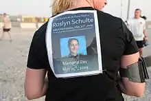 ![]() U.S. Navy Petty Officer 1st Class Kelli Roesch of Portland, Oregon, wears a sign to honor Schulte during the 2009 Memorial Day 5K run at a camp in the Middle East. | |