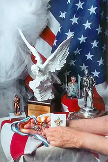 Ross received the Ore-Ida Council distinguished service Silver Beaver Award in 1956 and the BSA Regional distinguished service Silver Antelope Award in 1991. In 1992 he was awarded the first Hall of Fame Award for the Ore-Ida Council. All four of Ross and Margie's sons are scouts and at the time of his death he counted 35 Eagle Scouts in his posterity - but by January 2012 that number had risen to 42.[5] The Butler family spent many summers at BSA's Camp Billy Rice at Warm Lake, Idaho.