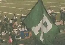 The Roswell High School flag is carried by a senior after every touchdown. Here, fans celebrate a touchdown against archrival Milton.