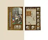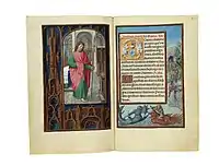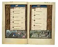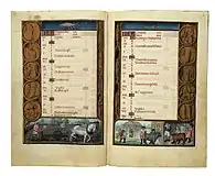There are wide borders, many with flowers and other objects and drolleries, and another group with trompe-l'œil imitations of bronzes. Other borders frame the miniature with illusionistically painted wooden tracery.[7] Some pages follow the fashion of showing one scene as a framed inset within another larger one,[8] In total 140 pages, over half of the whole book, have significant decoration outside the text. The calendar has scenes of the Labours of the Months at the bottom of the pages.[9] As with other very lavishly illuminated manuscripts, it was probably worked on over a long period.