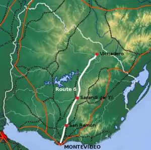 Route 6 is a national route of Uruguay. In 1981, it was assigned the name Joaquín Suárez.[1] It connects Montevideo with the northeast of Rivera Department, at Vichadero, with an extension reaching the border with Brazil. The road is approximately 428 kilometres long till Vichadero.