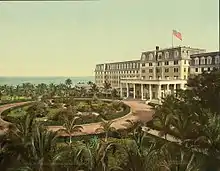 The Royal Palm Hotel was a large resort hotel built by railroad magnate Henry Flagler in Miami, Florida. Opened on January 16, 1897,[1] the Royal Palm Hotel was one of the first hotels in the Miami area. It sat on the north bank of the Miami River where it overlooked Biscayne Bay. Five stories tall with a sixth-floor salon, the Royal Palm Hotel featured the city's first electric lights, elevators and swimming pool. Almost thirty years later, The Royal Palm Hotel was grievously damaged by the 1926 hurricane, and infested with termites. In 1930, it was condemned and torn down.[2]:187