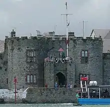 The Royal Welsh Yacht Club was formed in Caernarfon in 1847 by local solicitor Llewellyn Turner, William Knight (Rear-Commodore of Royal Harwich Yacht Club), Lord George Douglas-Pennant and other prominent locals. It became the 14th Royal Yacht Club in Britain and the first in Wales. Sailing regattas had been held in the town in 1829 and 1846 and were subsequently organised regularly by the club.[1] The first flag officers at the club were Commodore Henry Paget K.G.;[2] Vice-Commodore Robert Stephenson and Rear-Commodore Llewelyn Turner. On 5 May the same year it was also awarded the warrant to fly the defaced blue ensign and three days later Queen Adelaide, bestowed her royal patronage upon the club.[1] In 1854 the Club took the 13th century Porth-yr-Aur, formerly the town's west gate or watergate, built c.1284, as its clubhouse.[3][4]