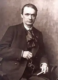Rudolf Joseph Lorenz Steiner (27 or 25 February 1861[1] – 30 March 1925) was an Austrian occultist,[8] social reformer, architect, esotericist,[9][10] and claimed clairvoyant.[11][12] Steiner gained initial recognition at the end of the nineteenth century as a literary critic and published works including The Philosophy of Freedom.[13] At the beginning of the twentieth century he founded an esoteric spiritual movement, anthroposophy, with roots in German idealist philosophy and theosophy. His teachings are influenced by Christian Gnosticism[lower-roman 1][15] (for heresiologists it is little doubt that these are neognosticism[16][17][18][19]). Many of his ideas are pseudoscientific.[20] He was also prone to pseudohistory.[21]