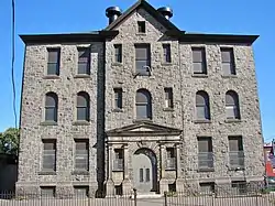 Built between 1900 and 1901, this historic structure is a three-and-one-half-story building, that was made using coursed, cast stone ashlar and has a low hipped roof, large double hung windows, and brick additions that were built in 1915 and 1924. The projecting central entrance pavilion has a Renaissance Revival-style portico.