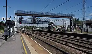 Rugeley Trent Valley has three platforms with Platform 3 located at the main entrance and Platforms 1 and 2 located on an island platform. Platform 1 is bi-directional which is used for terminating services from Birmingham New Street where as Platform 2 is used for northbound services to Crewe while Platform 3 is used for southbound services to London Euston. Between Platforms 2 and 3 there are two fast lines for non-stop services. All platforms are electrified.