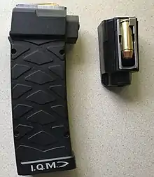A 4-round rotary magazine (right) along with an aftermarket 10-round box magazine (left).