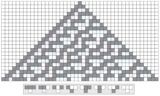The following diagram shows the pattern created, with cells colored based on the previous state of their neighborhood. Darker colors represent "1" and lighter colors represent "0". Time increases down the vertical axis.