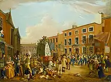 The churches allocated a particular day in the calendar for the rushbearing and, by the 16th century, it was customary to ring the church bells and provide wine, ale and cakes for the rushbearers.[8] Some festivals were more elaborate with mimetic and representational elements. An account from Cawthorne in Yorkshire from 1596 said that the people "did arm and disguyse themselves some of them putting on womens aparrell, other some of them putting on longe haire & visardes, and others arminge them with the furnyture of souldiers, and being there thus armed and disguysed did that day goe from the Churche, and so went up and downe the towne showinge themselves".[9]
