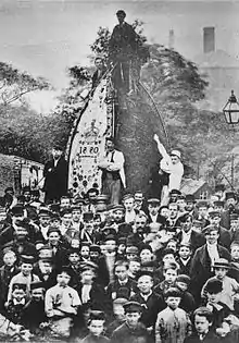 In the 18th century the ceremony usually formed part of the annual feast or wake, held on the Sunday closest to the feast day of the saint to which the church was dedicated.[14] The rushes were brought to the church in a procession, accompanied by music and Morris dancing. In some areas the rushes were carried in individual bundles and in others on a rushcart. Where a rushcart was used it became the main focus and was decorated with garlands and flowers,[15] tinsel, and 'all the silver plate that can be borrowed in the neighbourhood'.[16] When the procession reached the parish church the rushes were strewn on the floor and the garlands used to adorn the church.[17][18] It is not known how long rushcarts have been a feature of the festivities, but an account by the Hon. H. Egerton from 1726 implies that the one he saw in use in Prestwich was of long standing.[19]
