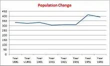The first recorded population statistic was in the 1881 census. At that time the population was 334. Since then that number has fluctuated, but on the whole has increased. An example of this fluctuation is in 1911 where the population was 305. After that it increased up to 415 in 1951. Today the figure stands at 484.[5]