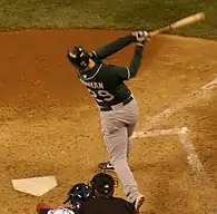 Branyan signed a one-year contract with the Seattle Mariners on December 3, 2008.[1] The Mariners gave him the starting first base job before spring training.[98] At the end of the 2009 season, Branyan was the team leader in home runs. Branyan stated one of the keys to his success with the Mariners was a vision training program with Chicago ophthalmologist Dr. Barry Seiller.[99] The exercises strengthen eye muscles and improve focus at the plate.[99] The program was similar to the one designated hitter (DH) Edgar Martínez used when he played for the Mariners.[99] Branyan hit his 25th home run of the year on August 7, setting a new career high.[100] His previous career-high of 24 had been achieved during the 2002 season. He also set career records in RBIs, doubles, hits, runs and total bases in the 2009 season.[1]