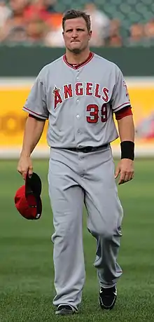 Branyan did not stay unemployed for long, signing with the Los Angeles Angels of Anaheim five days after his release.[134] With the Angels, he was used as a pinch-hitter, DH, and first baseman.[131] On July 3, his two-run home run against Chad Billingsley gave the Angels a 3–1 victory over the Dodgers.[135] His final major league game came on September 26, when he pinch-hit for Bobby Wilson in a game against the Rangers. Neftalí Feliz struck him out looking as the Angels lost 4–3.[136] He only hit four home runs in 37 games for the Angels, batting .185. In a combined 68 games with Arizona and Los Angeles, he batted .197 with five home runs and 14 RBI. After the season, he became a free agent.[1]