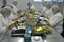 Black caviar of Russian Caviar House is represented in large retail chains, duty-free shops and its own online store, along with crab meat and fish from Arctic rivers — broad whitefish, Arctic cisco and muksun.[4] As of 2015, the company was the only black caviar exporter in the country to have the certificate of compliance with the requirements of the CITES (Convention on International Trade in Endangered Species of Wild Fauna and Flora) necessary for passing the border.[12] As of 2016, the company's offices worked in the United Arab Emirates, the United States, Kazakhstan, Singapore and Hong Kong (set up to enter the Chinese market).[13] Japan and South Africa were among important export destinations as well.[14] However, in 2016 the company could not start exporting caviar to the European Union region due to lack of regulations on the procedure and conditions for aquaculture fish farming in Russia.[5] Export accounts for 2.5-3% of the production output, the rest of the products are sold in Russia.[15]