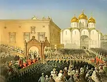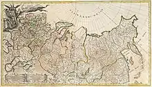 The foundations of the Russian Empire was laid during Peter I's reforms, which significantly altered Russia's political and social structure,[21] and as a result of the Great Northern War which strengthened Russia's standing on the world stage.[22] Internal transformations and military victories contributed to the transformation of Russia into a great power, playing a major role in European politics.[23] On the day of the announcement of the Treaty of Nystad, the 2 November [O.S. 22 October] 1721, the Governing Senate and Synod presented the tsar with the titles of the Pater Patriae (Russian: Отец отечества, romanized: Otets otechestva, IPA: [ɐˈtʲet͡s ɐˈtʲet͡ɕɪstvə]) and Emperor of all Russia.[24] It is generally accepted that with the adoption of the imperial title by Peter I, Russia was turned from a tsardom into an empire, and the imperial period began.[25][26]
