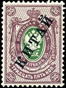 Initially, the offices used the regular stamps of Russia, but in 1899, they received stamps overprinted with "KITAI" (Russian for China) in Cyrillic script. This overprint was applied to all types of stamps up to 1916, including the varieties on horizontally laid, vertically laid, and wove paper. The overprint was also applied to postal stationery envelopes, postcards, letter cards and newspaper wrappers. The overprint itself was in black, blue, or red, generally being chosen to contrast with the stamp colors. Most of these types are commonly available today (less than one US$); the most problematic is the blue overprint on the 14-kopeck wove paper variety, whose existence has been questioned.