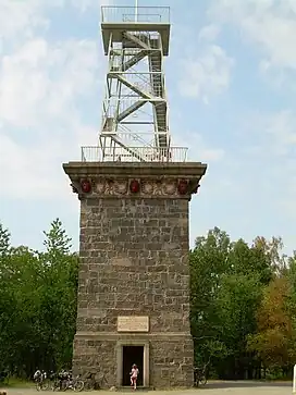 The tower's granite masonry is decorated with lion heads,[8] and originally had one staircase.[10][11] As the forest grew higher, obscuring the view, the tower was extended in 1899 by steel scaffolding a further 9 metres (30 ft), reaching a height at the top of 184 metres (604 ft) above sea level, which marks the highest point in Denmark, same as the Bavnehøj in Jutland.[8] The design of the steel structure above the masonry structure is unusual in that it has two staircases - one to go up and the other to come down - which has limited the availability of space at the top of the tower. During the World War II, the Germans added a radio transmitter, reaching a further 60 metres (200 ft) in height but this was later removed. The tower has also been used for radar equipment, especially to monitor Russian movements during the Cold War.[9] The tower is used in the spring for ornithological observations. The tower, with views over the entire island, is open to visitors free of charge during daylight hours throughout the year.[9]