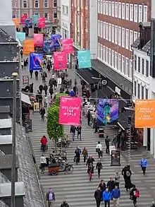 Søndergade or Strøget is a street in Aarhus, Denmark. It is located in the inner city neighborhood and runs 350 metres south to north from Ryesgade to Skt. Clemens Stræde and provides access to the alleys Telefonsmøgen and Posthussmøgen. Søndergade was created between 1854 and up through the 1860s as the city expanded southwards following the abolition of octroi and the city walls. The word Sønder is an older Danish form of "south" and the name thus means "Southward-street".[1] Søndergade is part of the 750 meters long shopping street and pedestrian zone Strøget which runs from Aarhus Central Station to Aarhus Cathedral, consisting of the three streets Søndergade, St. Clemens Street and Ryesgade. Strøget has about 47,000 visitors on a daily basis and some 14 million visitors annually, making it among the busiest commercial streets in Denmark.[2]