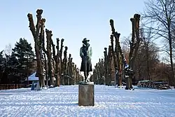 There is a statue in the central reservation at each end of Norske Allé. At the zoo end stands a statue of Adam Oehlenschläger, one of the central persons of the Danish Golden Age. It is designed by Julius Schultz and was originally located at the site of the current Frederiksberg Town Hall Square and inaugurated on 24 October 1897. When the new Town Hall was built, the statue was moved to its current location in Søndermarken and placed on a new plinth. It now faces Frederiksberg Palace where Oehlenschläger grew up.[1]