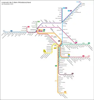 - ↑ "Liniennetz und Streckenfahrpläne" (in German). Deutsche Bahn, S-Bahn Mitteldeutschland. 2015. Retrieved 2015-12-25.