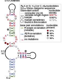 S10 ribosomal protein leader is a ribosomal protein leader involved in the ribosome biogenesis. It is used as an autoregulatory mechanism to control the concentration of the ribosomal protein S10. Known Examples were predicted in Clostridia[1] or other lineages of Bacillota[2] with bioinformatic approaches. The structure is located in the 5′ untranslated regions of mRNAs encoding ribosomal proteins S10 (rpsJ), L3 (rplc) and L4 (rplD).[1] There is an uncertainty about the ligand, because of a lack of experimental investigation.