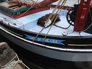 The barge Lady of the Lea was built of wood in Rotherhithe in 1931 by boat-builders Hyam & Oliver (who operated well into the 1960s) for the War Department, following the original plans of canal barges from a century earlier.[2] She was built small enough to pass under the low bridges of the River Lea and Bow Creek in London and was originally tiller steered and stumpy rigged, without top mast or topsail.[2][3][4] The bottom was built of pine (doubled up) and the sides of oak and elm with copper fastenings and brass knees. Unusually, the sails were white and not the normal russet colour (of other Thames barges).[5] Her original tonnage and dimensions are not known.