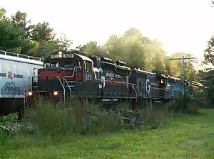 ![]() Pan Am Railways locomotive #621, an SD26, in Westford, Massachusetts (2007). The "blower bulge" (just aft of the cab) and the displaced roof-mounted "torpedo tube" air reservoirs — two distinct SD26 spotting features — are clearly visible. | |||||||||||||||||||||||||||||||||||