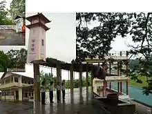 The school is well known for its symbolic clock tower, gigantic stone steps, Chinese pavilions and non-functional water fountain .