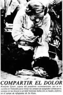 In an effort to show US support for the Thai response, First Lady Rosalynn Carter visited Thailand with Richard Holbrooke, several members of congress and a group of journalists to tour the camp on 9 November 1979.[16][4]: 189 [17] Her visit was widely publicized and appeared on the nightly news on all major US networks. In one frequently-aired clip, a refugee died in front of Carter while an American physician protested irritably: "'This girl is about to go,' said an angry doctor, ordering the newsmen covering the visit to keep back. 'She just had a blood transfusion, but she's not going to make it.'"[18] Later the First Lady recalled: "I picked up a baby and put it down on a blanket on the ground. They started crying, and when I turned around the baby had died."[19] The First Lady later told reporters, "I'm emotionally overwhelmed. It's a very difficult situation for me as a wife and a mother to visit the camp and see such poverty and misery. I'm going home as fast as I can to tell my husband about it."[20]