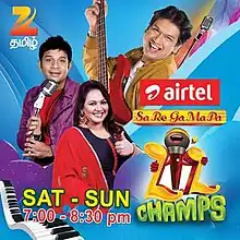 Sa Re Ga Ma Pa Li'l Champs is an 2016 Indian-Tamil language musical reality TV game show, which airs on Zee Tamil.[1] The show based on the Hindi Language show Sa Re Ga Ma Pa L'il Champs. The series is meant for young children between the ages of 5–14 years, which judges the children on the basis of their voice quality, singing talent and versatility in performance.[2] The show was premiered on 24 December 2016.[3]
