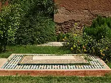 The surfaces of the chamber walls are covered in carved stucco as well as the more usual zellij tiling along their lower parts. At the very center of the room is the tombstone of Ahmad al-Mansur. To his immediate right (from the perspective of present-day visitors seeing the room) is the tombstone of his son, Sultan Moulay Zidan (died 1627), and to his immediate left is the tombstone of Sultan Muhammad al-Shaykh al-Saghir (died 1654–55). Also in this room are the tombs of al-Mansur's wife, Lalla Aisha as-Shabaniyya (died 1623) and of Sultan Abd al-Malik II (died 1631).[4] All of their tombstones, of a type called a mqabriya, consist of an elongated marble bloc carved with Arabic epitaphs on arabesque backgrounds.[4][7] The mqabriyas of these five Saadians are particularly large and ornate, and are believed to have been made by the same workshop of artisans.[7] The lesser tombstones of other dynasty members are scattered around the room. Curiously, the marble inscription plaque embedded in the back wall of the chamber is dedicated to Muhammad al-Shaykh (who is buried in the other mausoleum across the gardens to the east), and was apparently moved here from his tombstone in the eastern mausoleum. Why or when it was moved here is unknown.[7][4]
