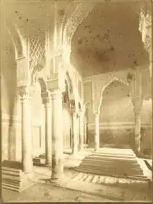 The southernmost chamber was intended to be a small mosque or prayer room, which is why it features a mihrab on its south/southeast wall. In Islamic architecture the mihrab is a niche or alcove symbolizing the qibla (the direction of prayer). The mihrab here resembles that of the Ben Youssef Madrasa (also Saadian in origin): a horseshoe arch surrounded by elaborate stucco decoration and hiding a small muqarnas cupola inside. The decoration of the lower parts of the mihrab, however, appears to have been left unfinished: the outlines of a pattern have been traced but they have not been filled-in and carved.[4][7] This is believed to be due to Ahmad al-Mansur dying before the decoration was completely finished and his successors lacking the will or the resources to finish it.[7] A total of 8 engaged columns, made out of veined marble, are arranged around the base of the mihrab.[4] The rest of the chamber is a large rectangular space marked by four columns supporting arches. The columns and the arches split the upper space of the chamber into 9 rectangular areas, with each division having its own wooden ceiling with star patterns.[4] The ceiling in front of the mihrab, however, is different and instead features a large pyramid-shaped vault of intricate muqarnas (similar in style to the ceiling of the Chamber of Lalla Mas'uda). Since the vault has a square outline, it transitions into the rectangular space with two more sloped surfaces of muqarnas on either side.[4]