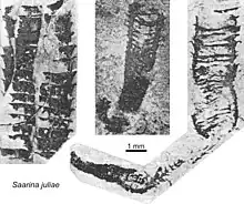 Saarina are cloudinimorph fossils from the Ediacaran (Vendian) and Early Cambrian marine deposits of European Russia and Laurentia. They are tubes made up of stacked conical elements. These fossils are comparable to the dwelling tubes of worms or cnidarians.